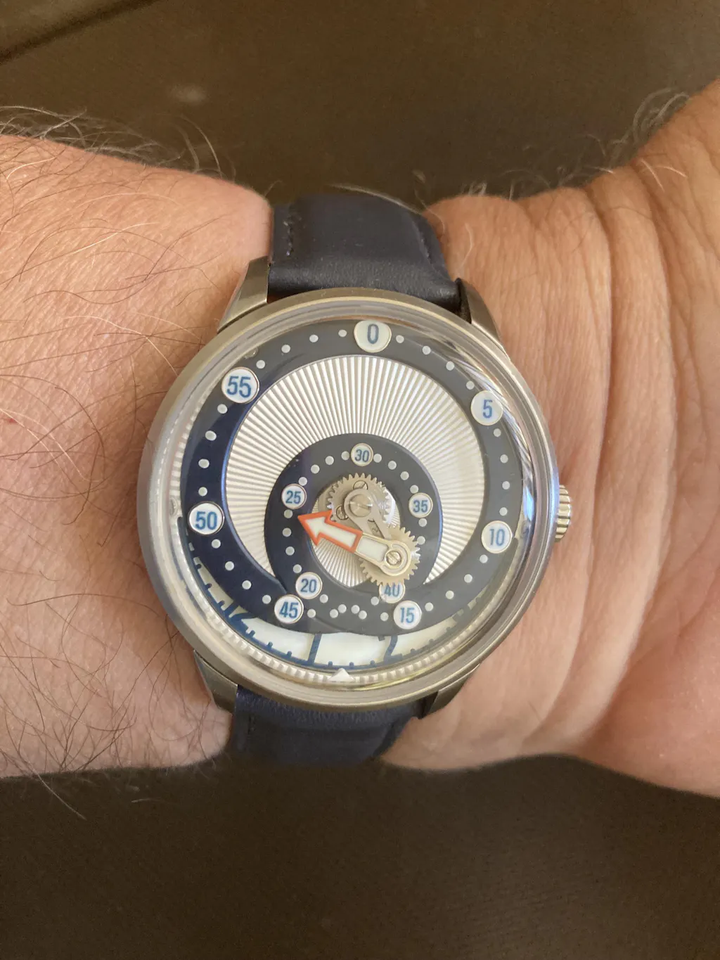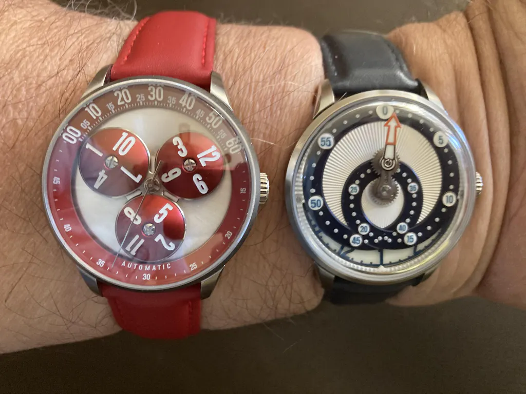 I collect watches. The gist of my collection is slide rule bezel watches. I’ve paid anywhere from $40 for Casios to $7,000 for Breitlings. I have about 100 slide rule watches. Plus, I have some novelty watches. A few years ago during Covid, I was considering a Zeric watch similar to the Mandetbrote Wandering Hour watch. I decided against the Zeric, but recently I took a look at the Mandetbrote Wandering Hour. It is less expensive than the Zeric, and as I've been happy with my Mandetbrot Secret Orbital, I bought a Mandetbrote Wandering hour watch. I love it, and I love my Secret Orbital. Two of my favorite watches. Both attract attention, and I may have inspired some people to buy their own.